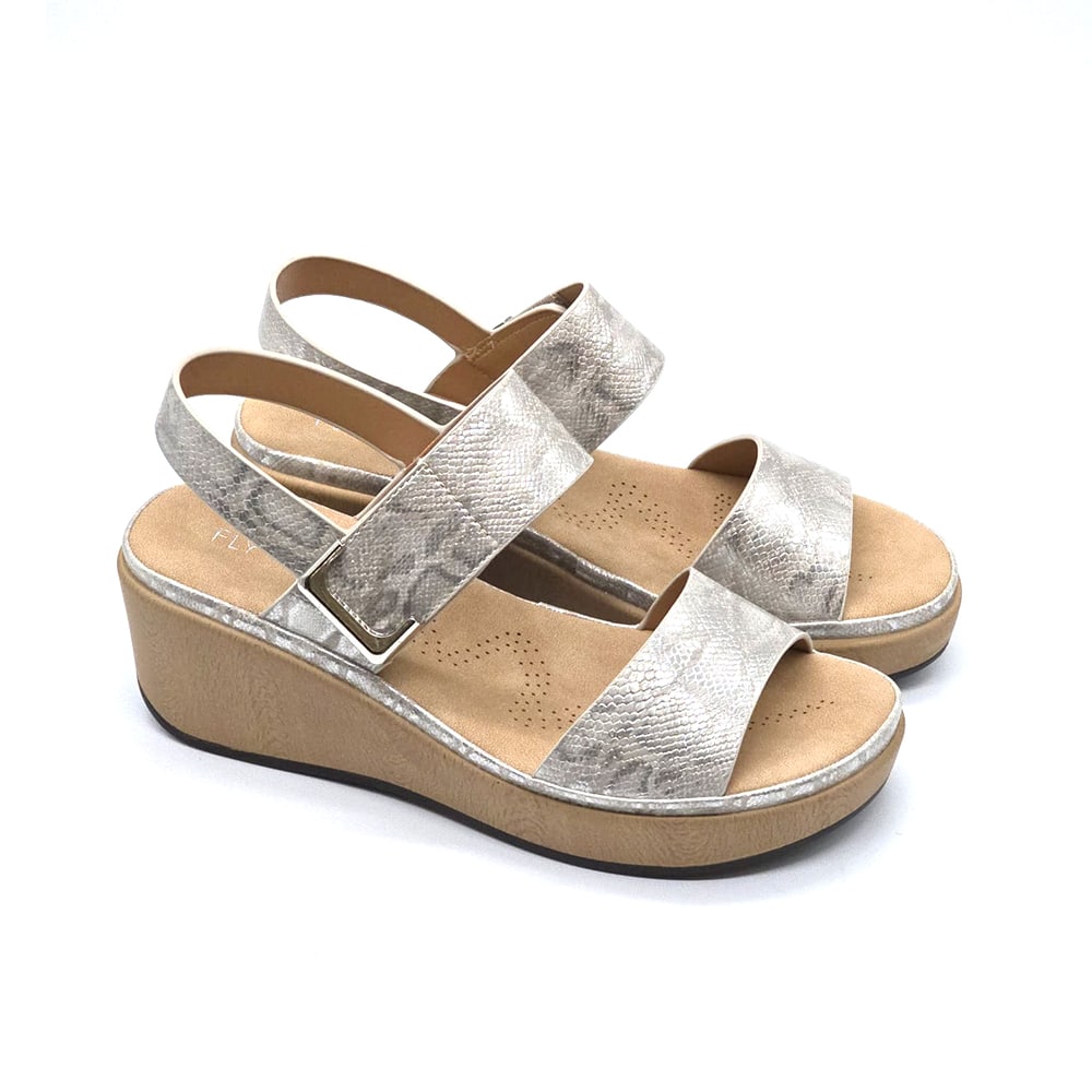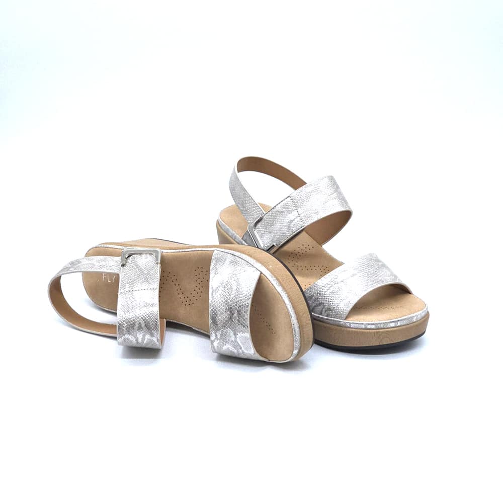 סנדל רומי לנשים של חברת פלייפוט בצבע כסף עם עקב דמוי עץ קליל, סוליית נוחות ורצועות רחבות בסגירת סקוץ'. עיצוב קייצי מרשים שמתאים לכל לוק.
